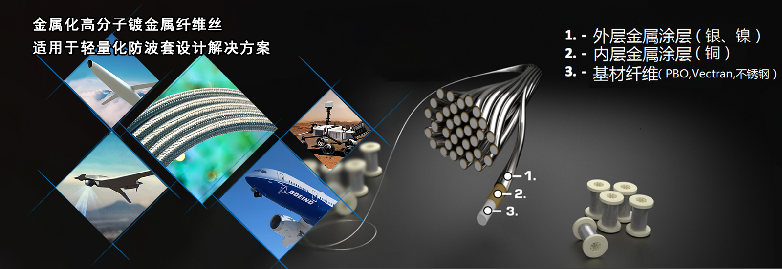 鍍金屬導(dǎo)電纖維絲是在高分子基材上雙層均勻涂鍍金屬,在航空航天線纜減重、機(jī)器人電纜屏蔽層、柔性天線、船舶拖曳電纜等減重和強(qiáng)度性能要求高的精密行業(yè)以更高的性能替代標(biāo)準(zhǔn)銅線,用作電纜、線束EMI屏蔽和專(zhuān)用導(dǎo)線。